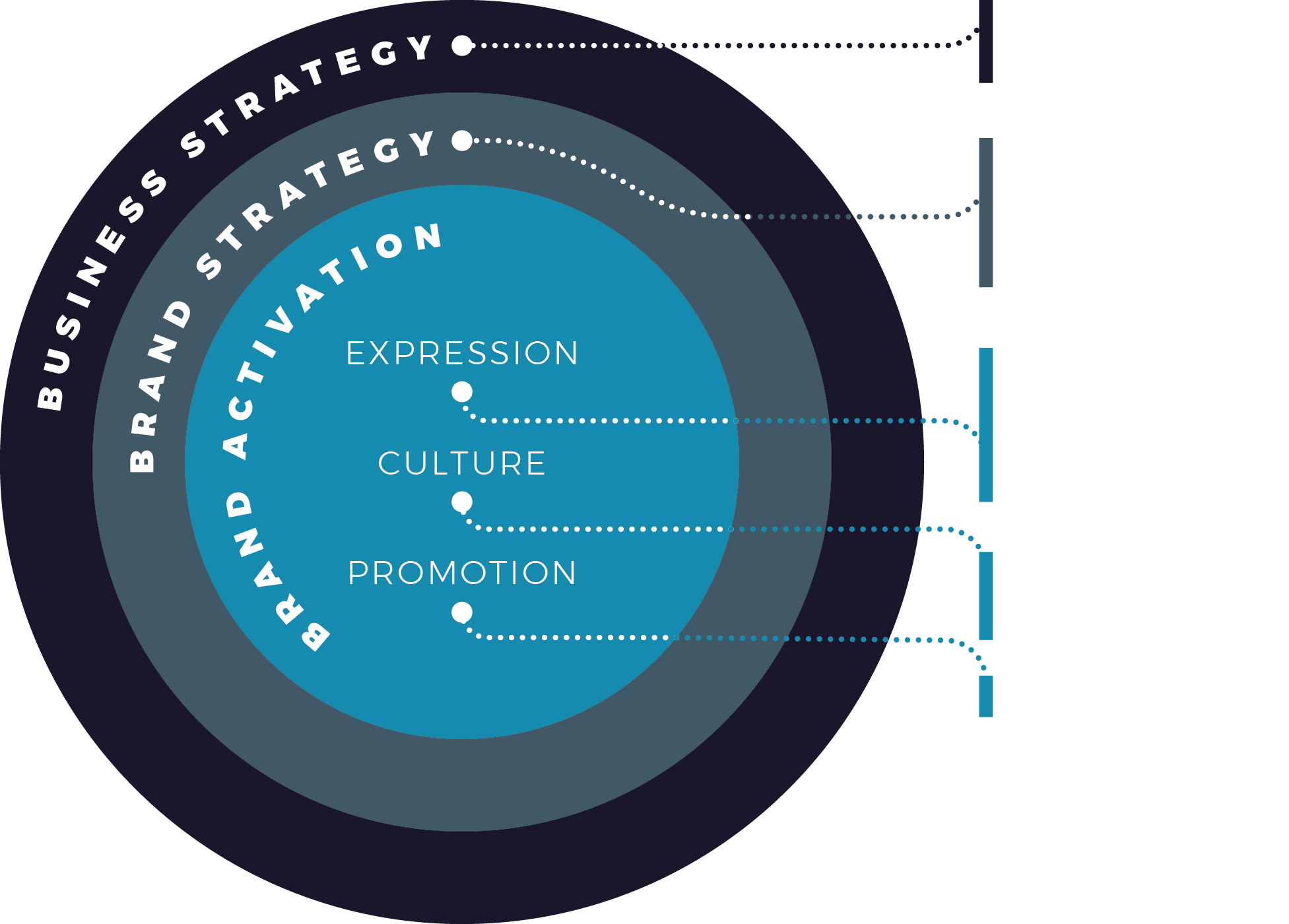 Our comprehensive approach, illustrated, builds strong brands from the inside out, starting with business strategy and flowing through brand strategy to brand activation.